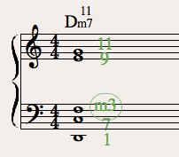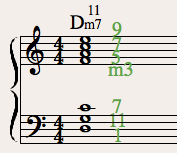 ポイントは左手が4度音程になるので低くなりすぎない位置にすること。11を低い位置で鳴らしているのでメロディーとのバッティングも問題ありません。左手で1, 7, 11をカバーできるので右手はm3,9を押さえれば良く、自由度も高くなります。その気になれば1をオミットして左手で11, 7, m3と弾けばすべての主要音をカバーすることもできます。